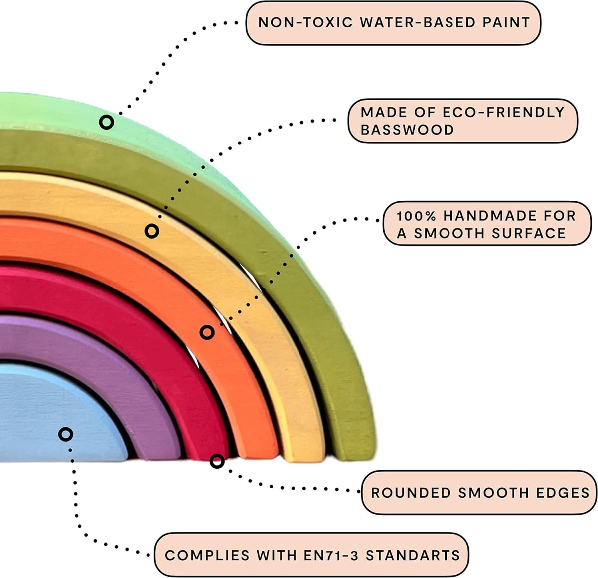 Conçu à partir de Basswood, un bois naturel reconnu pour sa robustesse et sa douceur au toucher, notre Arc-en-ciel Montessori garantit une utilisation durable. Chaque pièce est fabriquée à la main, assurant une finition lisse et sans aspérités. Pesant seulement 450 grammes, ce jouet en bois est à la fois léger et solide.