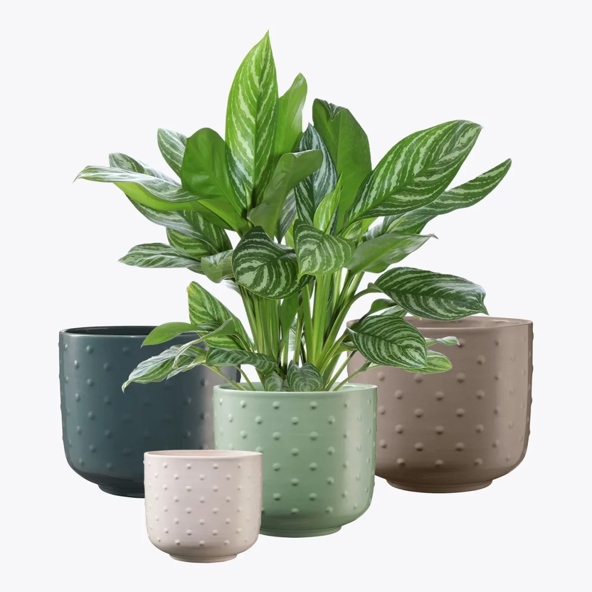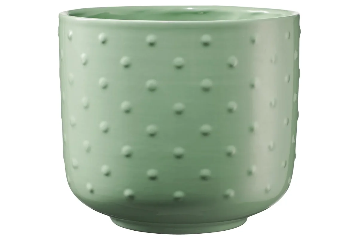 Une forme de cache-pot moderne et une une palette de couleurs attrayante. Les tons pastels brillants rose crème, vert céladon, grège et bleu vert font briller la surface en relief. Les couleurs émaillées confèrent également au pot un effet de profondeur unique.