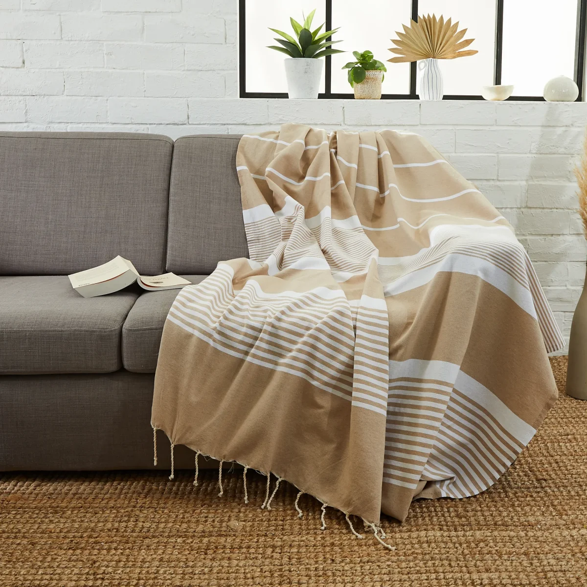 Optez pour l’élégance en grand format avec la fouta XXL Rayée, 200×300 cm, en coton recyclé, idéale pour partager à la plage, en pique-nique ou comme jeté de canapé à la maison.
