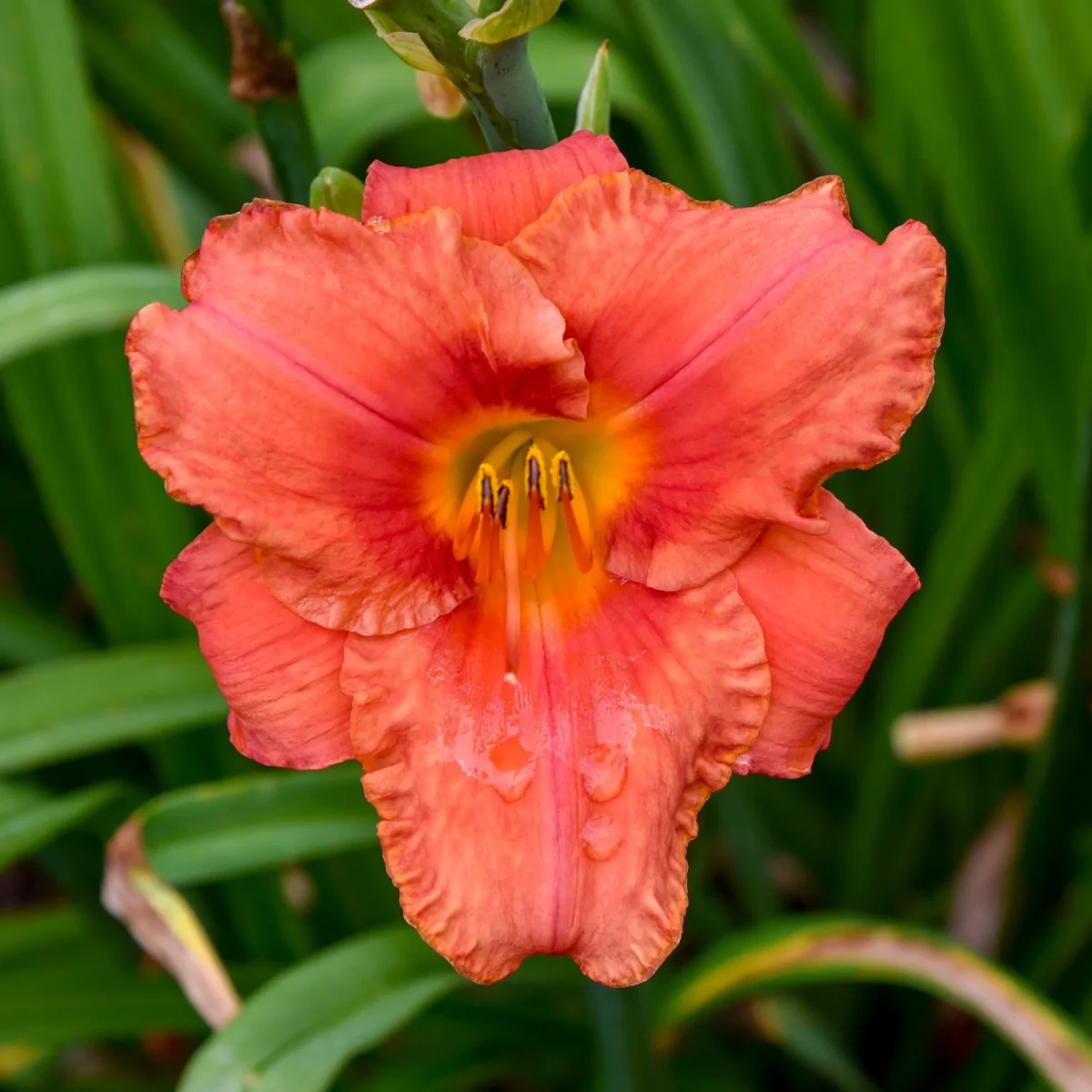 De juillet à août, l’Hémérocalle ‘Yvon Cléroux’ produit une profusion de fleurs aux teintes corail-tangerine vibrantes, rehaussées d’une bande rouge corail et d’une gorge jaune. Chaque fleur, d’environ 14 cm de diamètre, s’ouvre en fin d’après-midi et reste épanouie pendant une grande partie de la journée suivante, embaumant votre jardin d’un doux parfum.