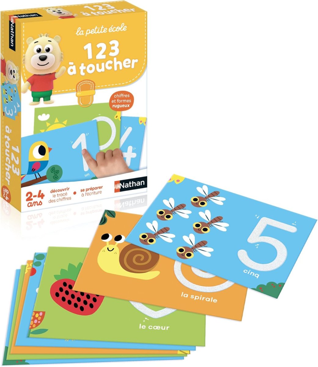 Notre jeu éducatif Montessori 1 2 3 à toucher propose des cartes recto-verso joliment illustrées. Ces 13 grandes cartes comportent un tracé rugueux que votre enfant peut suivre avec son doigt. Ce geste simple permet à l’enfant d’associer le chiffre vu avec le toucher, facilitant ainsi son apprentissage.
