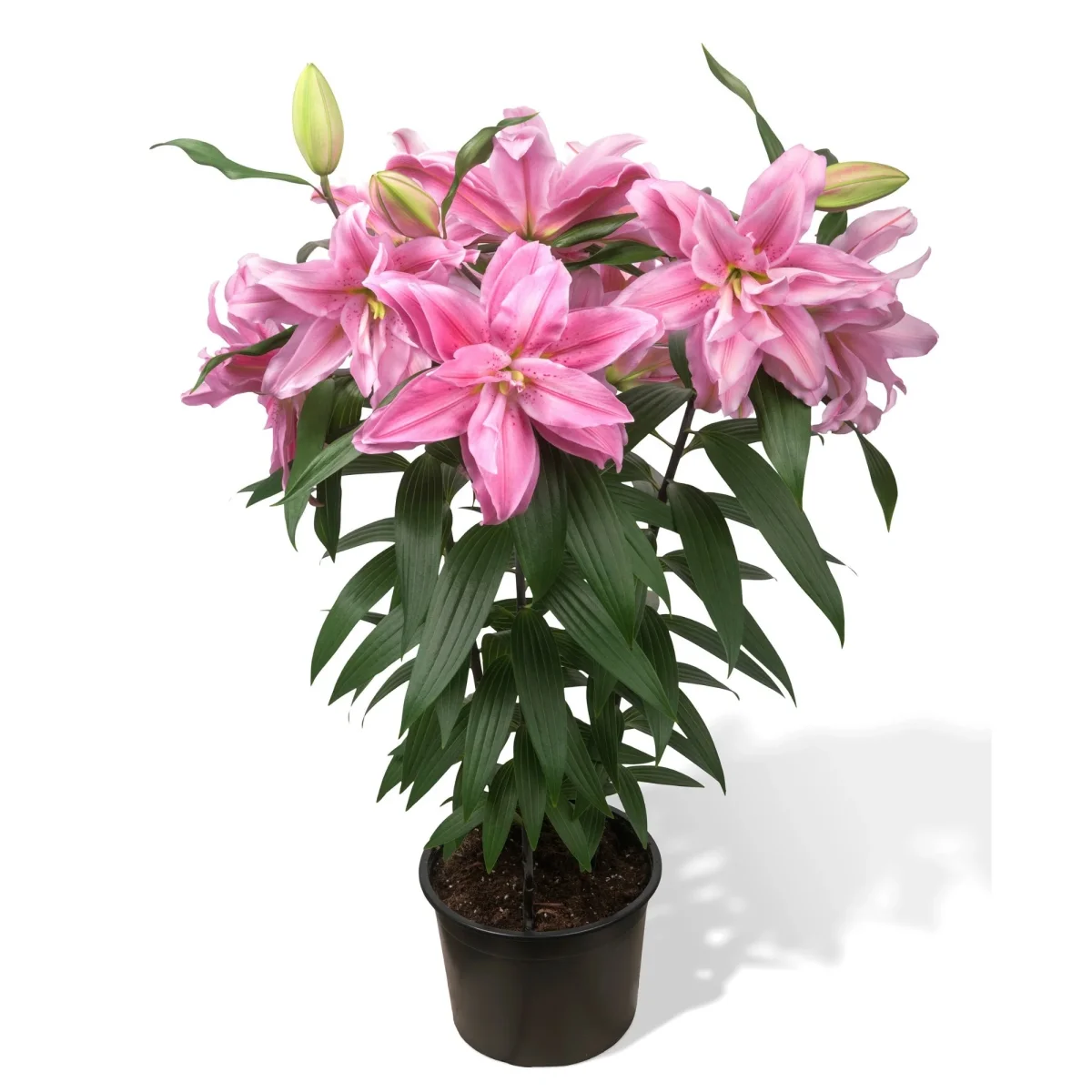Découvrez la splendeur du Lys oriental ROSELILY® Sara (Lilium orientalis ROSELILY® Sara), un joyau de la magnifique série Roselily®! Cette variété offre des fleurs spectaculaires, doubles et divinement parfumées, d’un rose éclatant avec une ligne centrale plus foncée qui traverse chaque pétale, créant un effet visuel saisissant. Atteignant des diamètres impressionnants de 10 à 25 cm (4 à 10 pouces), ces lys ont la particularité d’être sans étamine et donc sans pollen, ce qui les rend parfaits pour les bouquets sans risque de taches ni d’allergies.