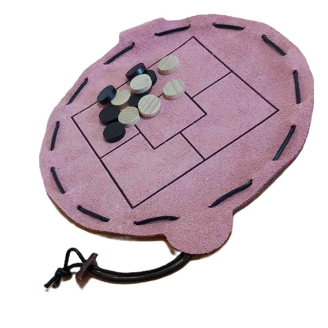Livré avec la règle de jeu, 6 pions noirs, 6 pions blancs, une bourse en cuir de 19cm de diamètre.