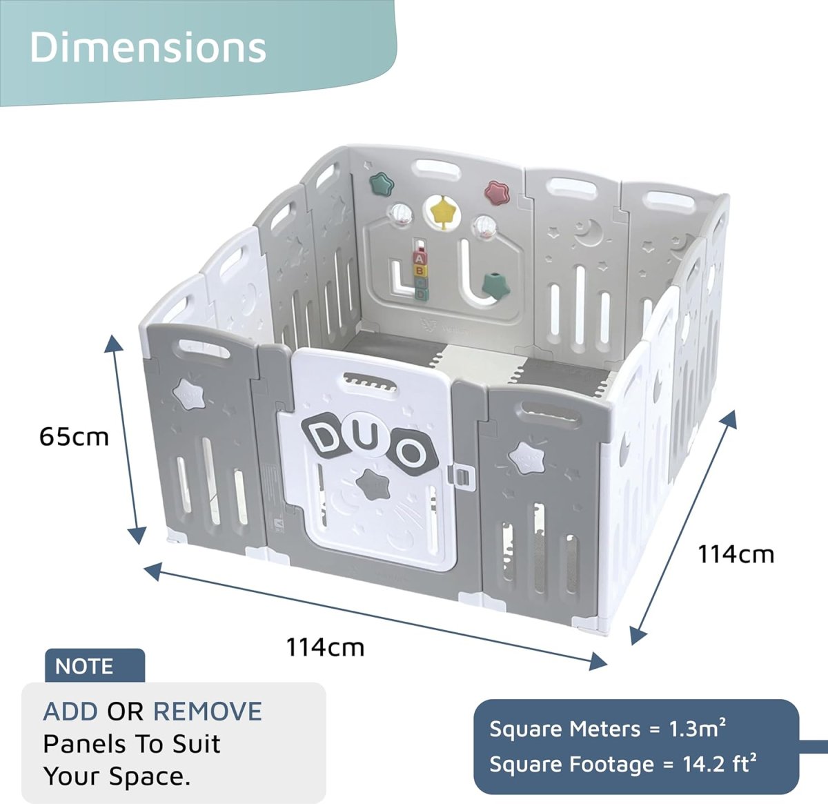 Le parc modulable Venture All Stars DUO Lite est conçu pour offrir à votre enfant un environnement sûr et agréable. Avec ses dimensions généreuses de 114 x 114 x 63 cm, il garantit un espace suffisant pour jouer, ramper et explorer en toute liberté. Grâce à sa conception robuste et ses matériaux de qualité, il assure une protection optimale tout en permettant aux parents de garder l’esprit tranquille.