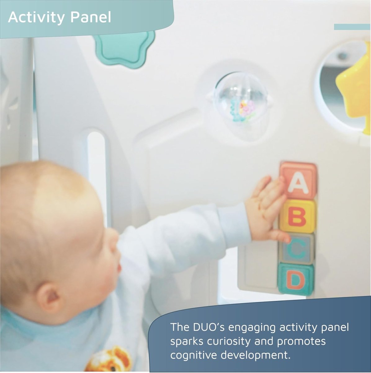 Stimulez la curiosité et le développement cognitif de votre enfant grâce au panneau d’activités intégré. Conçu pour être interactif, il propose des fonctionnalités ludiques qui encouragent l’apprentissage tout en amusant les tout-petits. Une véritable aire de jeu éducative qui accompagnera votre bébé dans ses découvertes quotidiennes.