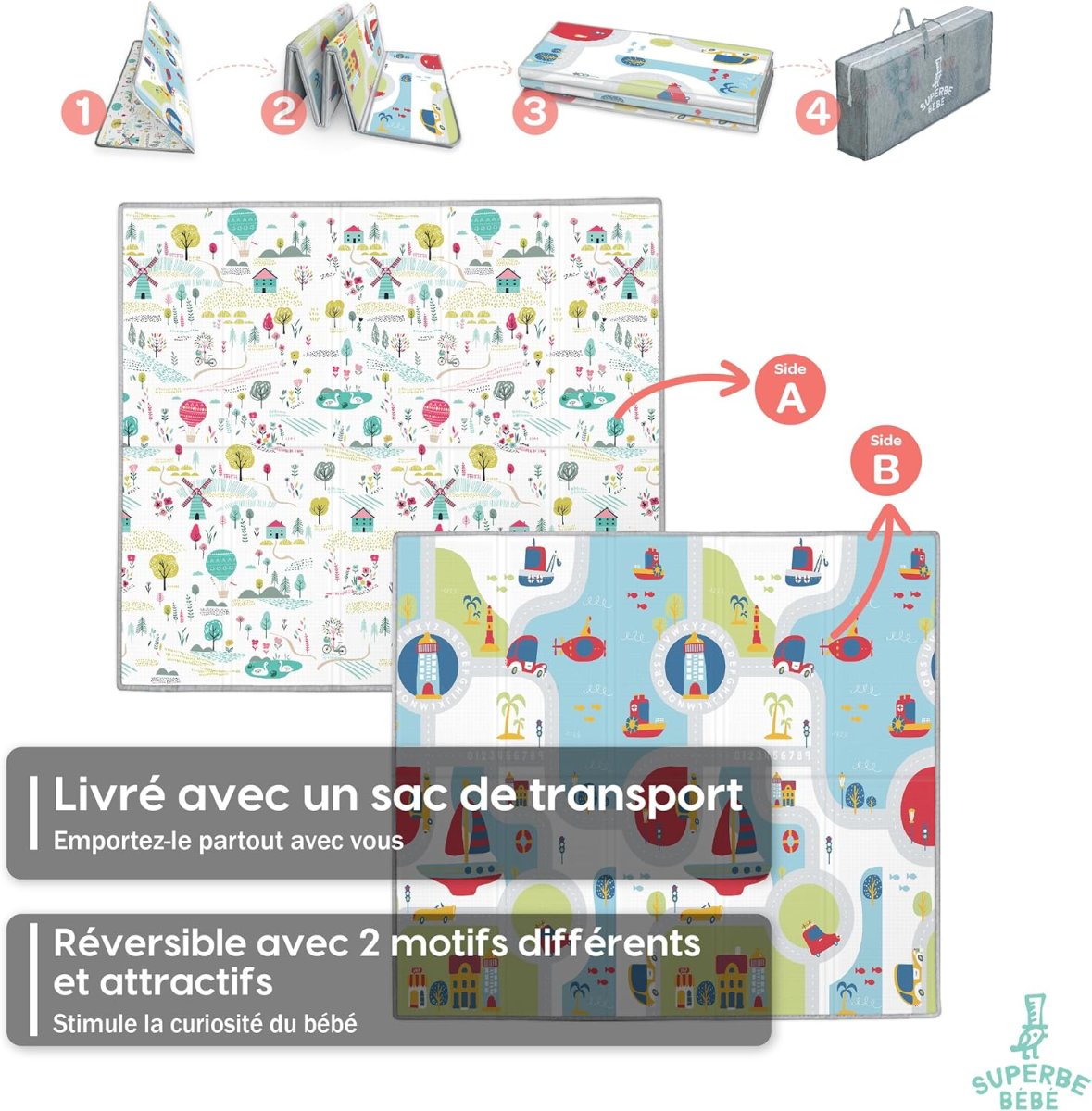 Le tapis d’éveil Montessori XXL a été conçu dans l’optique de faciliter la vie des parents. Pliable et léger (2,04 kilogrammes), il est facilement transportable grâce à sa housse fournie. Il est également réversible, offrant ainsi deux designs ludiques pour varier les plaisirs.