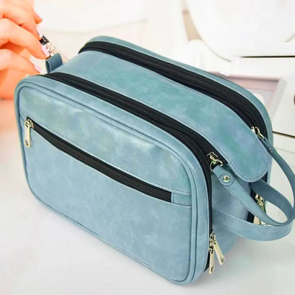 Fabriquée à partir de cuir véritable de haute qualité, elle promet durabilité et élégance. Sa couleur bleue unique ajoute une touche de fraîcheur et de distinction à votre routine de soins, se démarquant dans la salle de bain ou dans votre bagage.